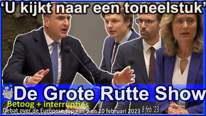 Betoog Gidi Markuszower (PVV) over de Mark Rutte show, een toneelstuk dat heel Nederland al 10 keer heeft gezien. Een betoog waar Kamervoorzitter Vera Bergkamp meermaals ingrijpt en Markuszower vraagt het niet persoonlijk te maken wanneer deze spreekt over “Diva’tje Kaag”, inclusief interrupties Sjoerd Sjoerdsma (D66) en Ruben Brekelmans (VVD) – Debat over de Europese top van 9 & 10 feb, Tweede Kamer.