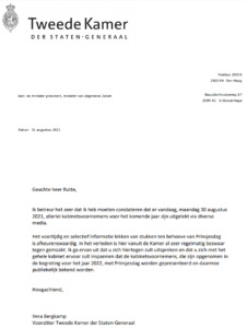 Kamervoorzitter Vera Bergkamp stuurde vandaag, 31 augustus, een ‘brandbrief’ aan Mark Rutte. Bergkamp schrijft het ‘zeer te betreuren dat er allerlei kabinetsvoornemens zijn uitgelekt via diverse media’.