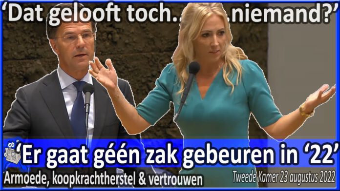Lilian Marijnissen ‘De scholen zijn weer begonnen en er zijn steeds meer kinderen die met honger naar school gaan’ vraagt Mark Rutte naar zijn mening, Rutte: ‘Je kon het ook wel een beetje door je oogharen zien aankomen’ zegt dat het Kabinet al veel doet. Marijnissen vraagt of Rutte de opvatting van Hoekstra over 10 miljard t.b.v. koopkracht deelt. Rutte zegt hier geen mening in te hebben, aangezien de VVD geen leider meer kent. Marijnissen stelt dat Rutte bezig is met relatietherapie, in plaats van de bestaanszekerheid die voor miljoenen Nederlanders speelt. Rutte is van mening dat er voldoende onderling vertrouwen in het Kabinet heerst om door te gaan. Vera Bergkamp probeert het ook nog een keer en herhaalt – tevergeefs- de vraag van Marijnissen (en later gesteld door kuiken).