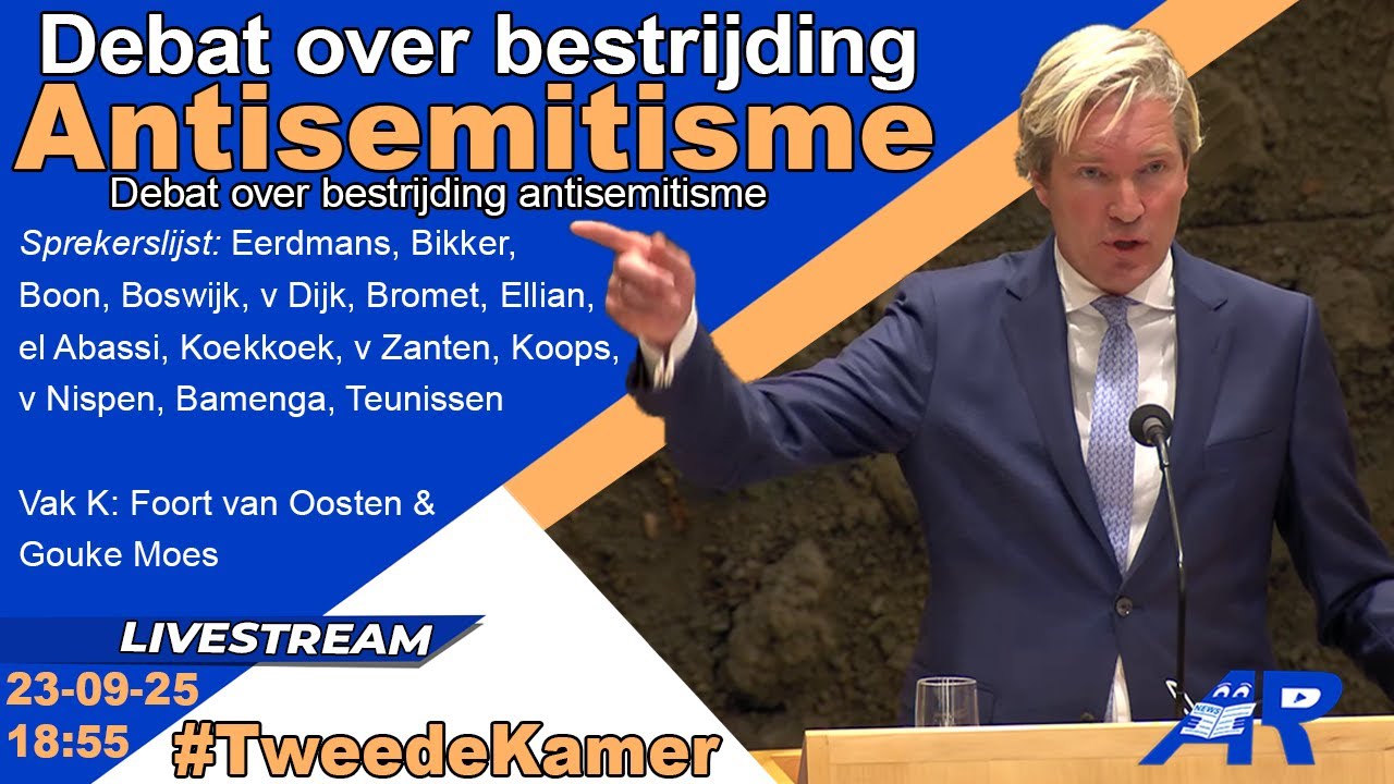 De Tweede Kamer debatteert op dinsdag 23 september over de maatregelen tegen antisemitisme met de ministers Foort van Oosten van Justitie en Veiligheid en Gouke Moes van Onderwijs, Cultuur en Wetenschap.