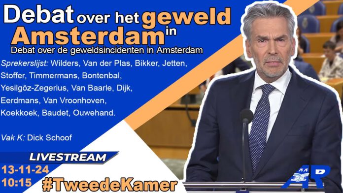 De Tweede Kamer debatteert met Minister-president Schoof, Minister van Binnenlandse Zaken Judith Uitermark en met de Minister van Justitie & Veiligheid David van Weel over de recente gebeurtenissen rond de wedstrijd tussen Ajax en Maccabi tel Aviv in Amsterdam. Geert Wilders (PVV) heeft hiervoor een debataanvraag gedaan die door de voltallige Kamer werd gesteund.