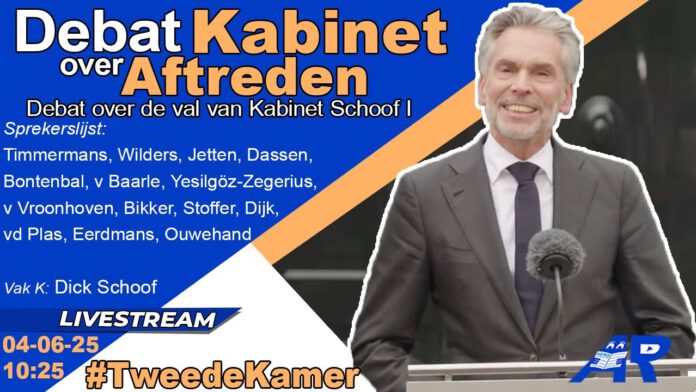 De Tweede Kamer debatteert op woensdag 4 juni vanaf 10.25 uur over het aftreden van het kabinet. Minister-president Dick Schoof legt eerst een verklaring af en neemt daarna deel aan het Kamerdebat.