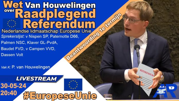 De Tweede Kamer debatteert op donderdag 30 mei over een Wetsvoorstel van Pepijn van Houwelingen betreffende het houden van een raadplegend referendum over het Nederlandse lidmaatschap van de Europese Unie (Wet raadplegend referendum Nederlands EU-lidmaatschap).