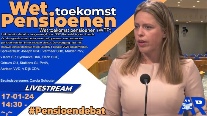 Het plenaire debat is aangevraagd door NSC-Kamerlid Agnes Joseph. Op de agenda staat onder meer het opnemen van bestaande pensioenrechten in het nieuwe stelsel. De overgang naar het nieuwe pensioenstelsel moet uiterlijk 1 januari 2028 plaatsvinden. Om de vinger aan de pols te houden is er – onder andere – een regeringscommissaris transitie pensioenen aangesteld.