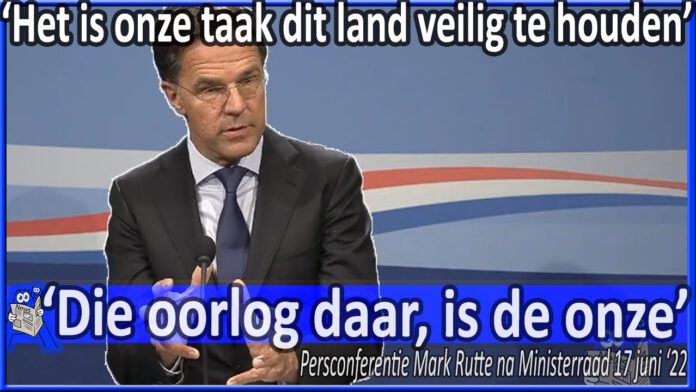 Mark Rutte: ‘Die oorlog daar, is de onze. Als wij niets doen moet je je afvragen wie het volgende slachtoffer is. Oekraïne moet winnen maar formeel zijn we niet in oorlog met Rusland’.