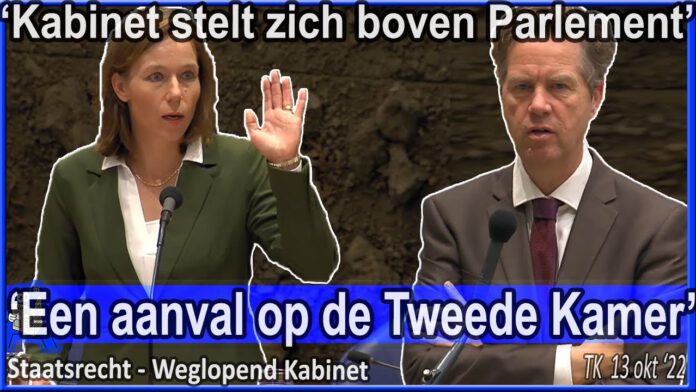 Martin Bosma (PVV) interrumpeert Hanke Bruins Slot (Minister BZK) over de wegloopactie van het Kabinet. Bosma stelt dat dit incident staatsrechtelijk niet door de beugel kan en de regering zich hiermee boven het parlement plaatst. Hanke Bruins Slot zegt dat de wegloopactie van het Kabinet een spontane actie was en heeft begrepen dat het niet meer zal gebeuren. – uit de begroting BZK