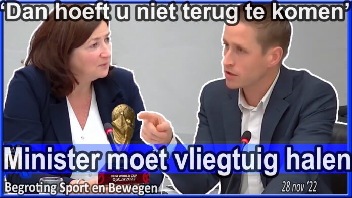 Minister Conny Helder zegt het debat te moeten verlaten omdat ze het regeringsvliegtuig richting een voetbalwedstrijd van het Nederlands elftal in Qatar moet halen. Saillant detail, de Kamer heeft een motie aangenomen welke het Kabinet oproept geen afvaardiging naar Qatar te sturen. Michiel van Nispen (SP) is duidelijk en komt met een oplossing: ‘Als de Minister dit debat verlaat hoeft ze wat mij betreft niet terug te komen’ – Begroting Sport & Bewegen.